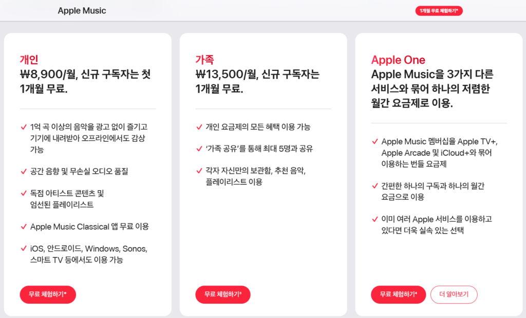 현재 국내에서 서비스 중인 애플뮤직 가격은 사용자의 상황에 따라 크게 세 가지 요금제로 나뉘어 운영되고 있습니다.